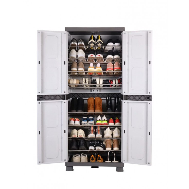 Αποτελείται από 2 πόρτες, 8 ράγες για παπούτσια χωρητικότητας έως 40 ζεύγη. Η εύκολη συναρμολόγηση παράλληλα με την ανθεκτική της κατασκευή στις καιρικές συνθήκες την καθιστούν ως μία ιδανική λύση για το μπαλκόνι σας ή το γκαράζ. Διαθέτει 5 πόδια για καλύτερη στήριξη και εύκολο καθάρισμα.