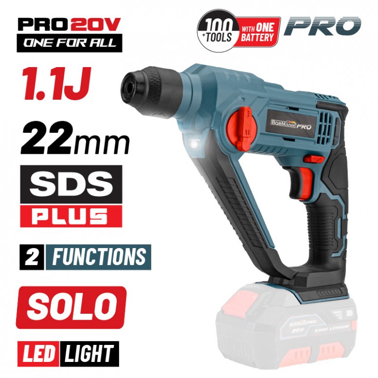 Με πνευματική κρούση, η διάτρηση μπετόν και τσιμέντου γίνεται παιχνίδι. Η εργονομική λαβή επιτρέπει τον άνετο και ασφαλή χειρισμό του τρυπανιού κάθε στιγμή. Εύκολη και γρήγορη εναλλαγή τρυπανιών χάρη στο SDS-PLUS τσοκ που διαθέτει. Το ενσωματωμένο LED παρέχει μεγάλη ορατότητα ακόμη και σε σκοτεινό περιβάλλον εργασίας. Συμβατό με την πλήρη σειρά μπαταριών BormannPro 20-Volt.