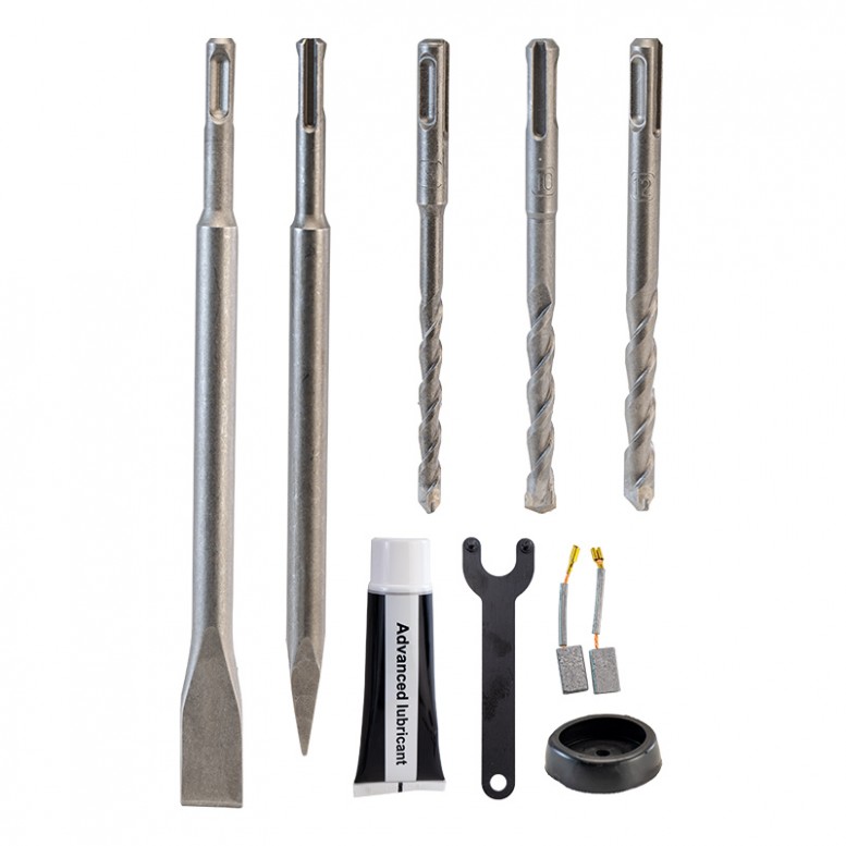 • ΠεριλαμβάνειΒοηθητική Λαβή , 3x Τρυπάνια : 8/10/12x150mm , Βελόνι 18x320mm , Καλέμι 18x320mm , Ψύκτρες , Γράσσο
