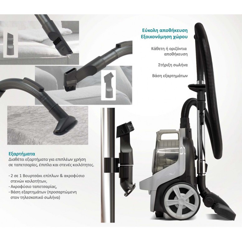 Είναι ιδανική για καθάρισμα όλων των τύπων δαπέδων και χαλιών και διαθέτει εξαρτήματα για επιπλέων χρήση σε ταπετσαρίες, έπιπλα και στενές κοιλότητες.